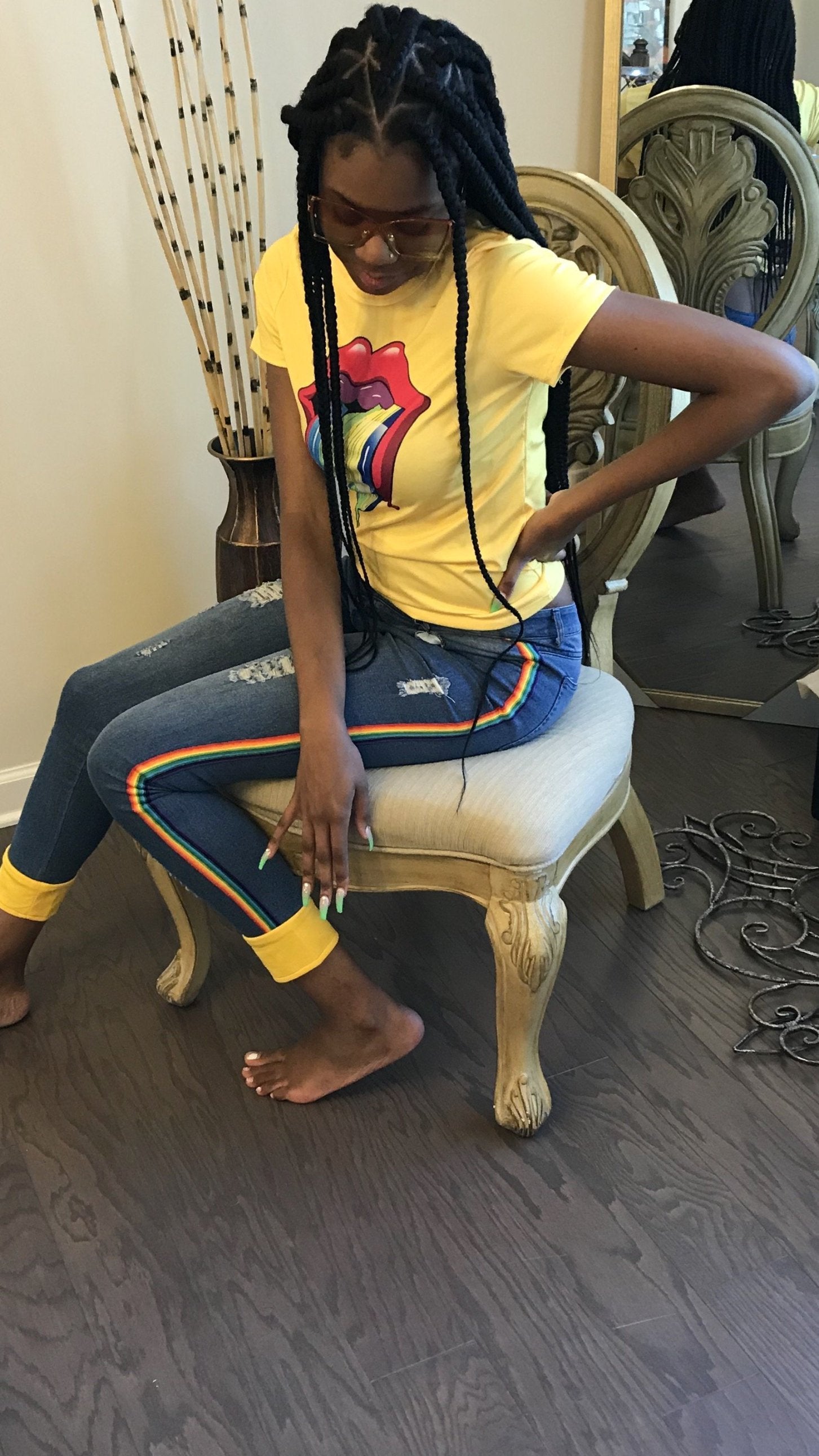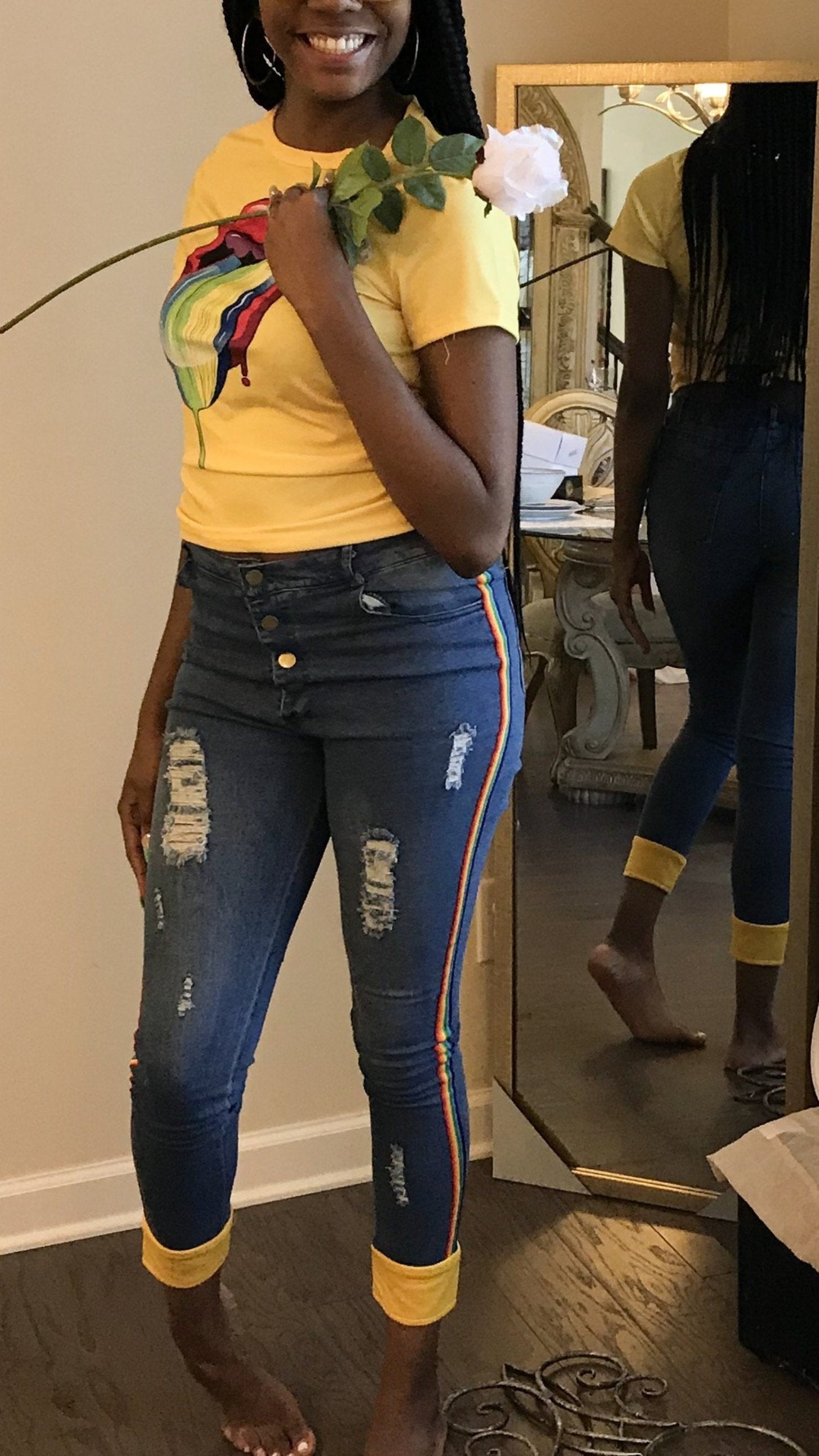 Great Fit. Rainbow stripe down the side of each pant leg. Folded cuff with yellow colored fabric to add a stylish look.